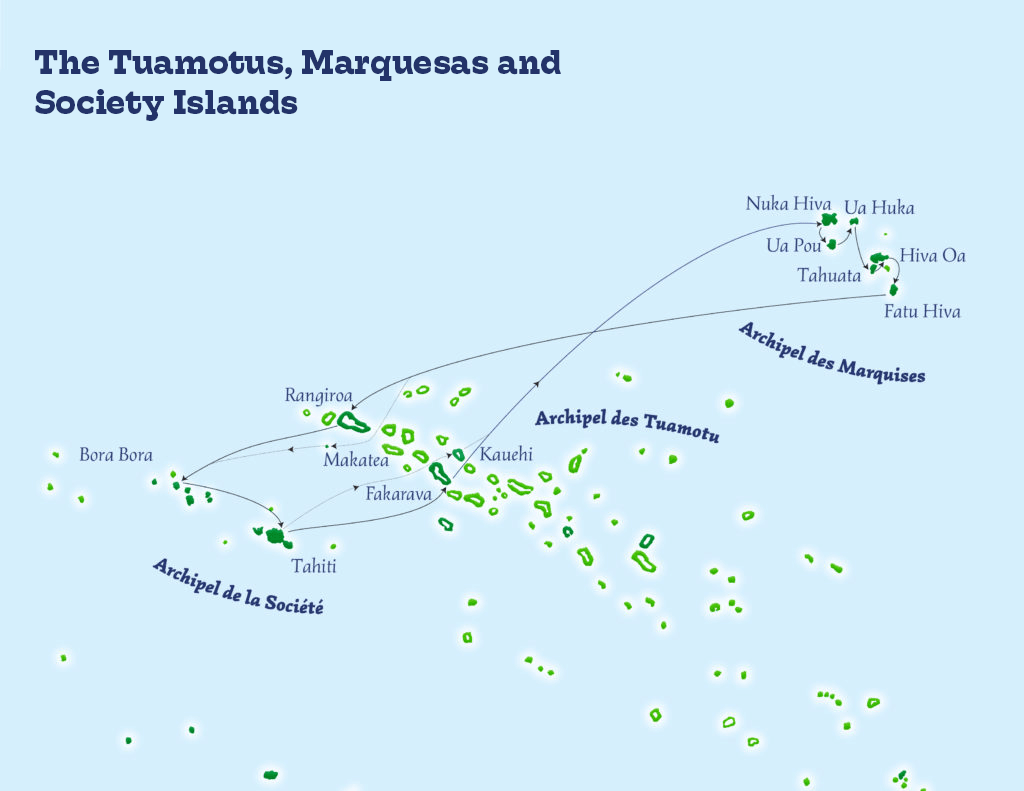 Located 1,500 km northeast of Tahiti, the Marquesas archipel ago consists of 12 islands, only 6 of which are inhabited. The Marquesas Islands emerge from the Pacific Ocean, high and lush. Nature is raw and its charm powerful. It is a land of stories and legends, as fascinating as it is unforgettable. Welcome to the Marquesas, the “Land of Men”.